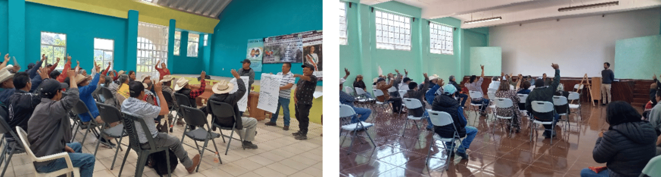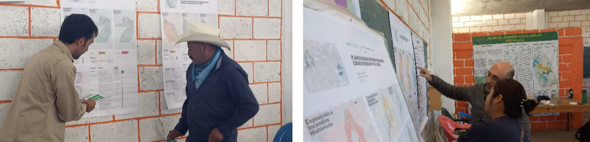Talleres participativos en seis ejidos Entre marzo y abril realizamos talleres con cada ejido para identificar y priorizar dos medidas clave: Adaptación al cambio climático Conservación de la biodiversidad Los resultados fueron validados en asambleas ejidales, donde también presentamos un análisis sobre los impactos del cambio climático a nivel regional y local, incluyendo mapas de zonas críticas por sequía, inundación e incendios.
